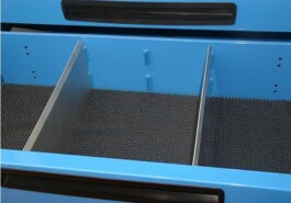 Die Schubladen gleiten auf Führungen aus verschleißfestem Spezialmaterial. Jede Schublade kann mit bis zu zwei Unterteilungen aus Aluminium ausgestattet werden und daher verschieden großes und für verschiedene Zwecke dienendes Material aufnehmen. Die Etikettenhalter an der Vorderseite dienen zur einfachen Kennzeichnung des Inhalts, um während eines Eingriffs keine kostbare Zeit für das Suchen nach Teilen zu verlieren.